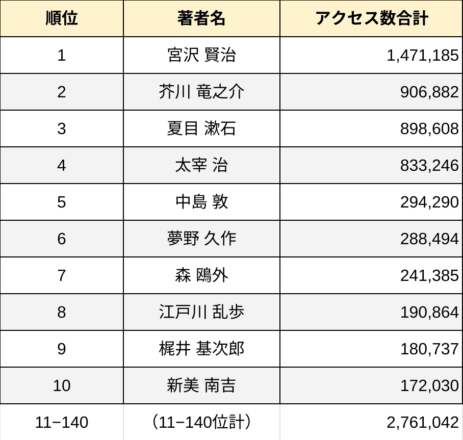 【青空文庫】著者別アクセスランキング(XHTML版 2021年)