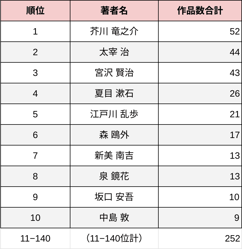 こちらは「芥川 竜之介」がトップとなった。