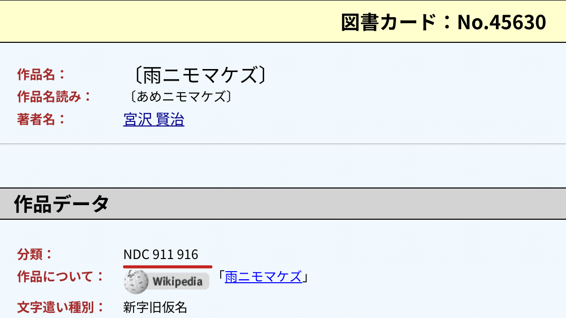 上記〔雨ニモマケズ〕は「NDC 911」 の「詩歌」に分類されると同時に、「NDC 916」の「記録、手記、ルポルタージュ」にも分類される。