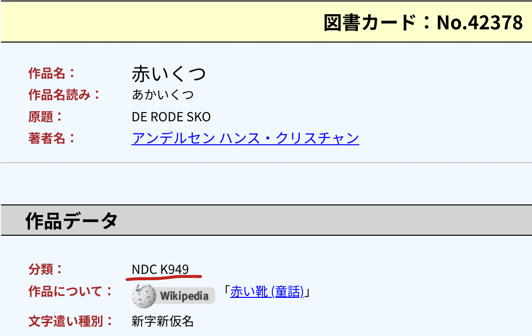 上記の「赤いくつ」の場合は、「NDC 949」の「その他のゲルマン文学」である「児童書」と分類される。