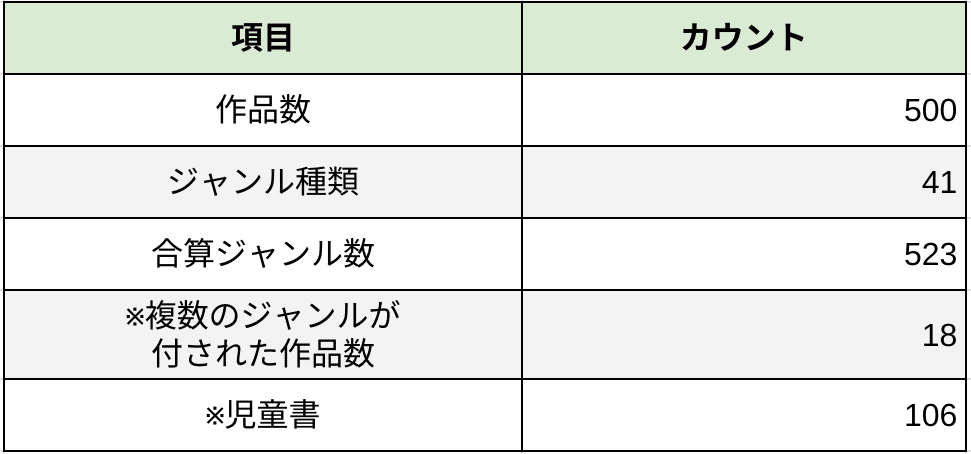 3. 一つの作品に複数のジャンルがある場合は個別のジャンル数に加算