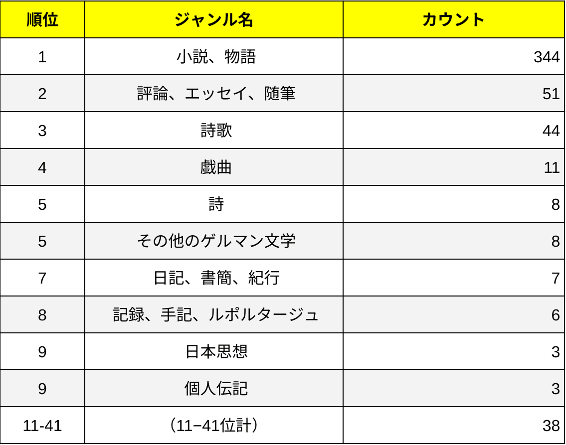 ※厳密には「(日本文学の)小説、物語」や「(英米文学の)小説、物語」などで割り当てられている番号は異なるが、今回は原書の言語ではジャンルを区別せずに集計している。